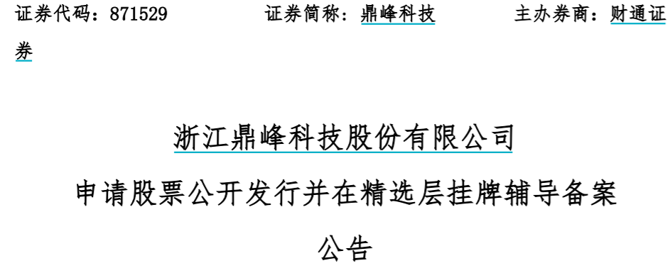 鼎峰科技公告显示,公司于2021年10月19 日向浙江证监局提交了向不特定合格投资者公开发行股票并在精选层挂牌的辅导备案材料,辅导机构为财通证券,公司已与财通证券股份有限公司签署相关辅导协议。