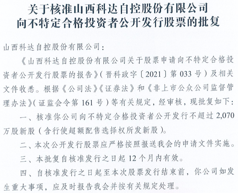公告显示,科达自控于2021年100月15日收到中国证券监督管理委员会下发的《关于核准河南同心传动股份有限公司向不特定合格投资者公开发行股票的批复》,核准公司向不特定合格投资者公开发行不超过2070万股新股(含行使超额配售选择权所发新股),该批复自核准发行之日起12个月内有效。