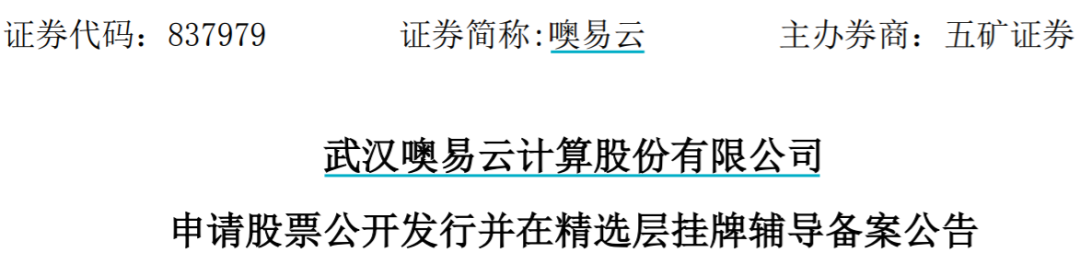 噢易云公告显示,公司于2021年10月18日向湖北证监局报送了公开发行股票并在精选层挂牌的辅导备案材料,辅导机构为五矿证券。