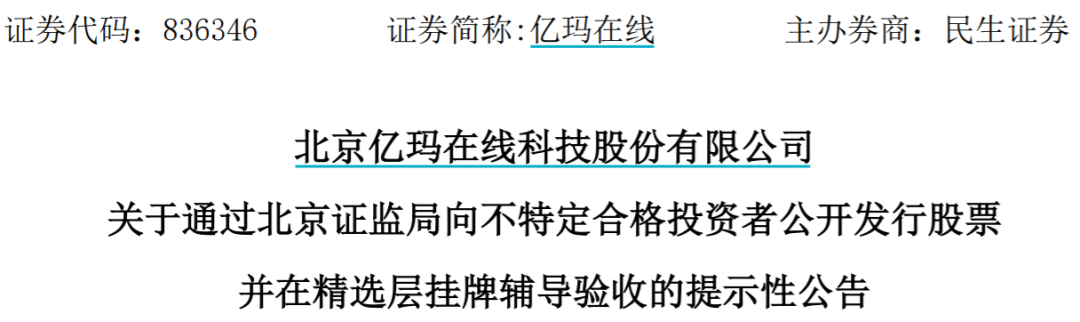 2021年10月19日,亿玛在线收到北京证监局下发的《关于北京亿玛在线科技股份有限公司公开发行股票并在精选层挂牌项目辅导工作的无异议函》,公司在民生证券股份有限公司的辅导下已通过北京证监局的辅导验收。