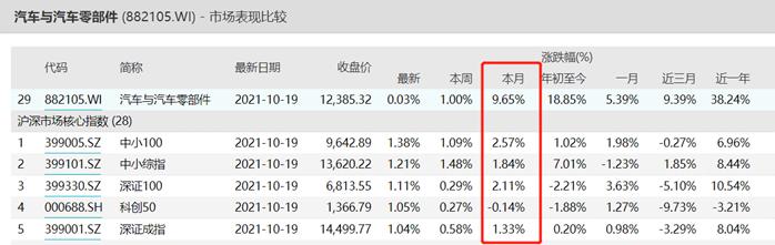 经历了9月大跳水的汽车股价进入10月份后一扫连续几周的阴霾。Wind数据显示,上周(10月11日-10月15日),汽车板块上涨5.0%,沪深300指数下降0.04%。从板块排名来看,汽车行业上周涨幅在申万28个板块中位列第1 位。最新数据来看,截至10月19日,wind汽车与汽车零部件本月以来涨幅近10%。
