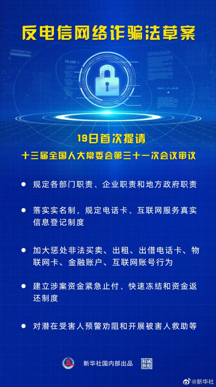 反电信网络诈骗法草案19日首次提请十三届全国人大常委会第三十一次会议审议。