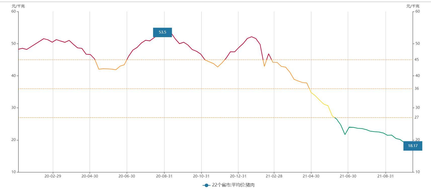 自去年10月至今,猪肉价格一路断崖式下跌。统计数据显示,截至10月15日全国22个省市平均猪肉价格为18.17元/千克,对比年初最高52.17元/千克,接近腰斩再腰斩。