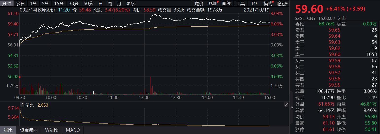 今日(10月19日),A股猪肉板块再度全线飘红。“猪茅”牧原股份股价大涨超6%,报59.6元/股,最新市值3137亿元。
