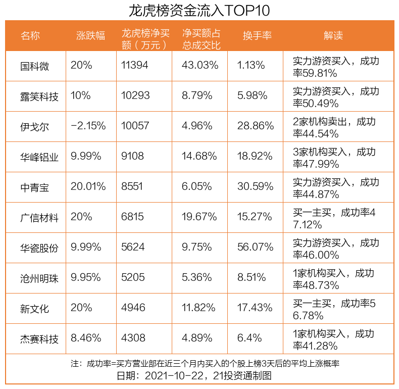10月22日,上证指数下跌0.34%,深证成指上涨0.33%,创业板指上涨0.17%。盘后龙虎榜数据显示,共有43只个股因当日异动登上龙虎榜,资金净流入最多的是国科微(300672.SZ),达1.14亿元。