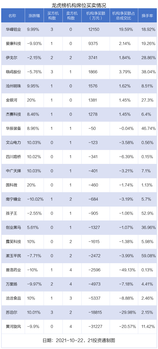 其中,机构净买入金额最多的是华峰铝业(601702.SH),当日收盘上涨9.99%,换手率为18.92%。
