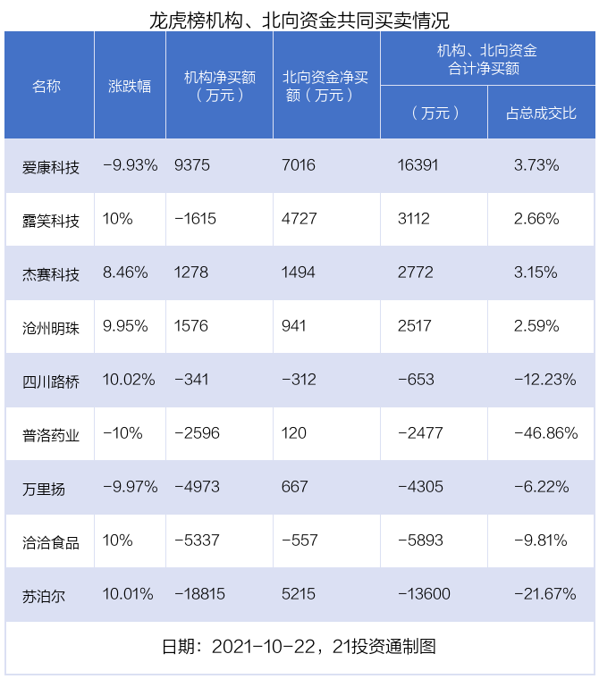 值得注意的是,机构和北向资金共同净买入了爱康科技、杰赛科技、沧州明珠等3股;共同净卖出了四川路桥、洽洽食品等2股;在苏泊尔,露笑科技,万里扬,普洛药业上出现分歧。