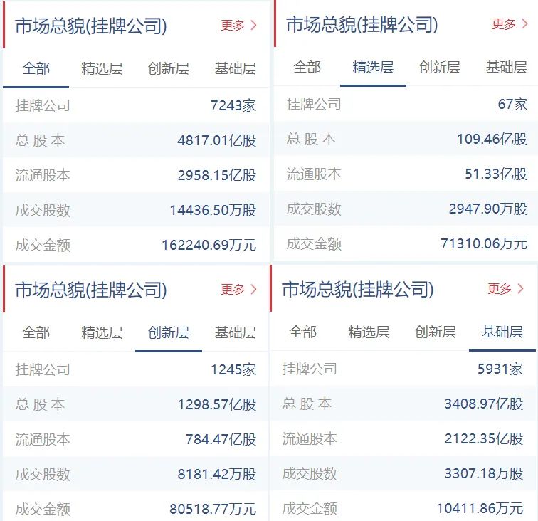 新三板挂牌公司总计7243家(精选层67家,创新层1245家,基础层5931家),总股本4817.01亿股,流通股本2958.15亿股。