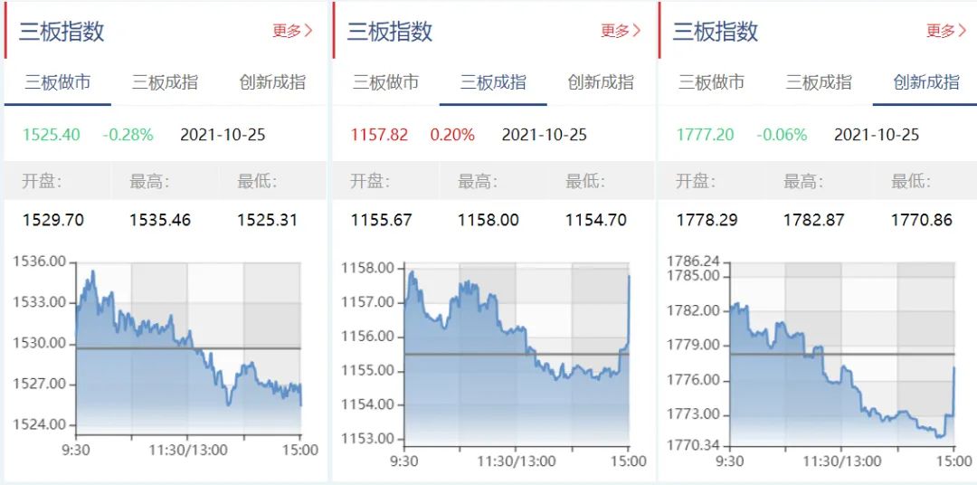 截至10月25日收盘,三板做市报1525.40点下跌0.28%;三板成指报1157.82点,上涨0.20%;三板创新报1777.20点,下跌0.06%。