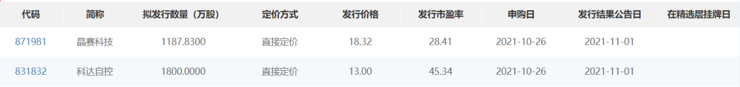 据全国股转网站显示,晶赛科技(871981)、科达自控(831832)将于10月26日(周二)精选层打新。