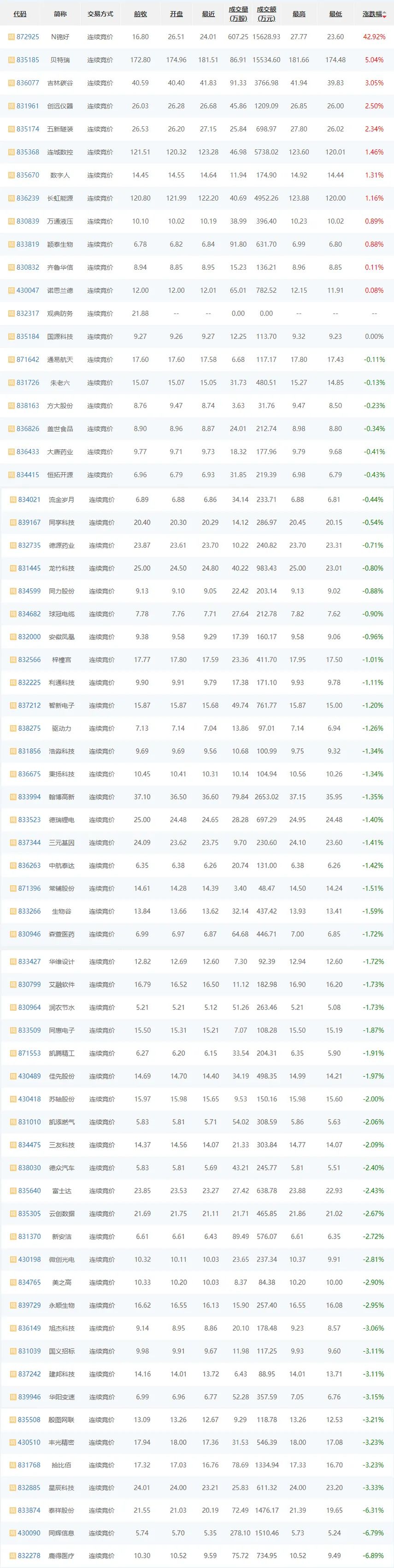 截至10月25日收盘,今日成交金额为16.22亿元,精选层成交金额为7.13亿元,创新层成交金额为8.05亿元,基础层成交金额为1.04亿元;今日成交股数为14436.50万股,精选层成交股数为2947.90万股,创新层成交股数为8181.42万股,基础层成交股数为3307.18万股。
