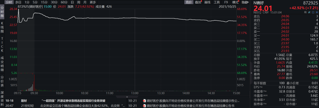 10月25日,锦好医疗(872925)成功挂牌,成为第67家挂牌精选层企业,也是北交所成立后首家挂牌精选层公司。