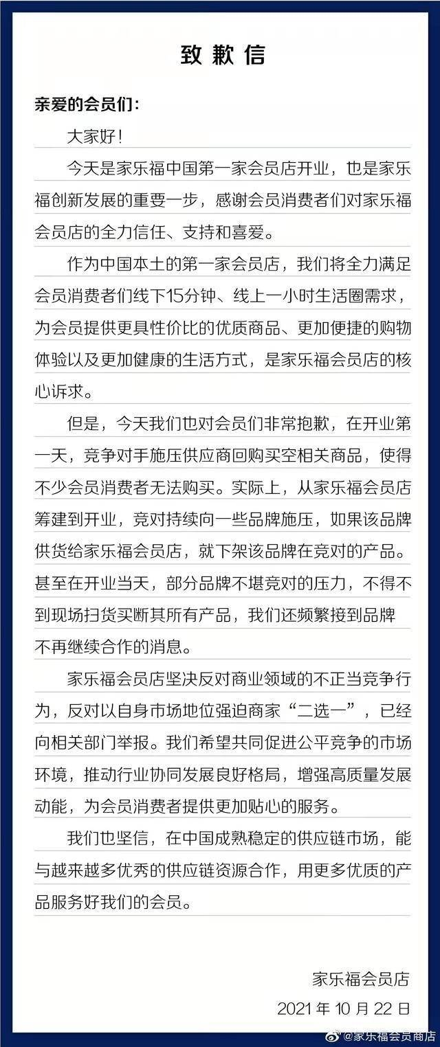事发当天,家乐福会员店官方微博发出一封致歉信,对消费者无法购买相关商品致歉,但家乐福称,这是“竞争对手施压供应商回购买空相关商品”导致。