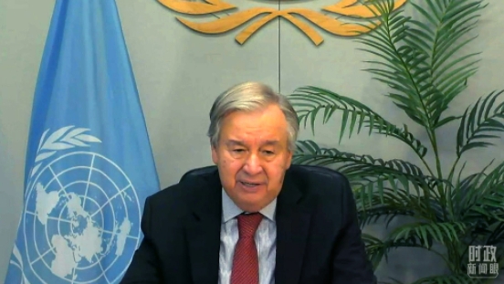 △联合国秘书长古特雷斯通过视频方式发表致辞。