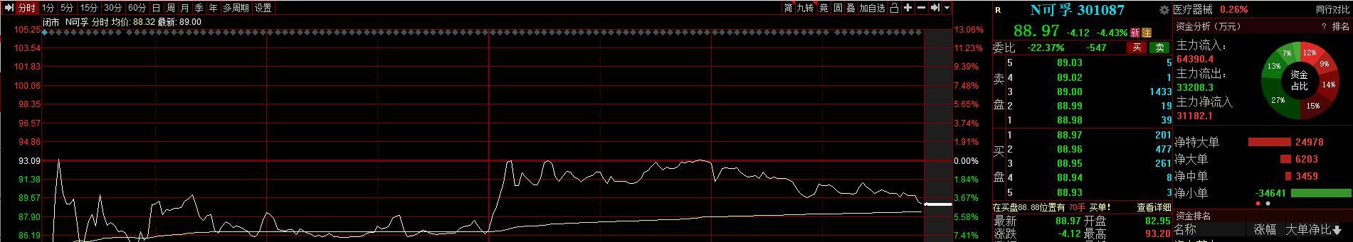 10月25日开盘,创业板首日上市新股N可孚(可孚医疗,301087)直接破发,盘中最大跌幅为10.89%。截至收盘,该公司跌幅缩小至4.43%,股价报收88.97元/股。