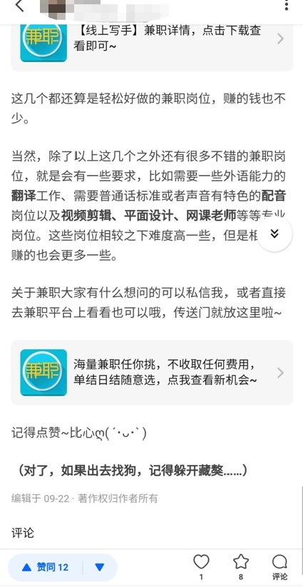 其中一条检索结果中显示,作者反复强调“高收益”“赚钱”“靠谱”“正规”“踩过坑”等关键词,并展示了一张“兼职收入”账单截图和多个软件下载链接。