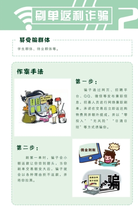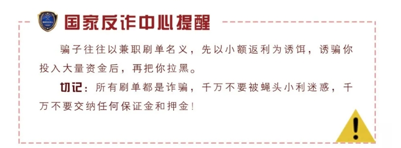刷单返利诈骗中,骗子通过网页、招聘平台、QQ、微信等发布兼职信息,招募人员进行网络兼职刷单,承诺在交易后立即返还本金并额外提成,并以“零投入”“无风险”“日清日结”等方式诱骗。