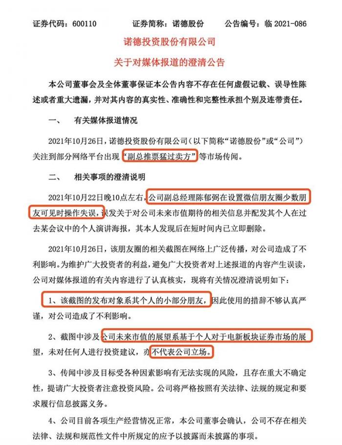 公司在澄清公告中称,10月22日晚10点左右,诺德股份副总经理陈郁弼在设置微信朋友圈少数朋友可见时操作失误,误发关于对公司未来市值期待的相关信息并配发其个人在过去某会议中的个人演讲海报,其本人发现后在短时间内已立即删除。