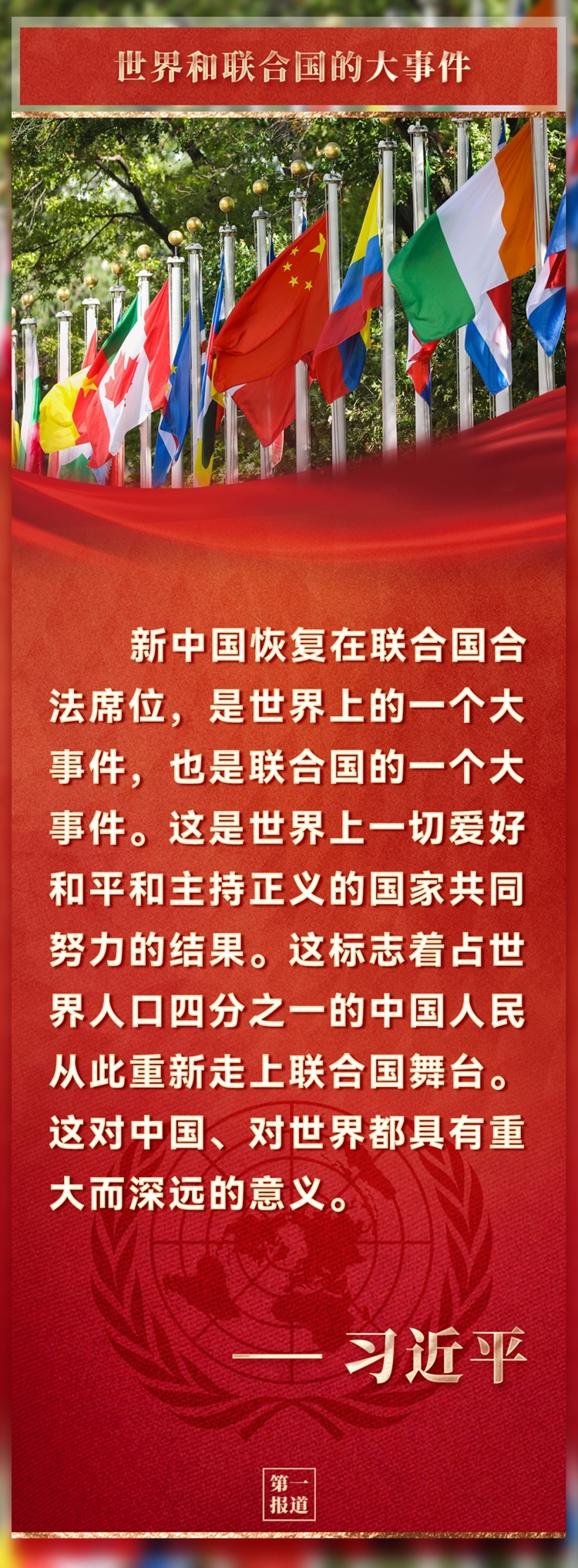 1971年10月25日,第二十六届联合国大会以压倒性多数通过第2758号决议,决定恢复中华人民共和国在联合国的一切权利,承认中华人民共和国政府代表是中国在联合国的唯一合法代表。这是中国人民的胜利,也是世界各国人民的胜利。这是世界公道正义的胜利,也是联合国宪章宗旨和原则的胜利。自此,占世界人口近四分之一的中国人民在联合国有了真正代表。联合国的普遍性、代表性和权威性得到切实增强,世界和平与发展的力量得到空前壮大。
