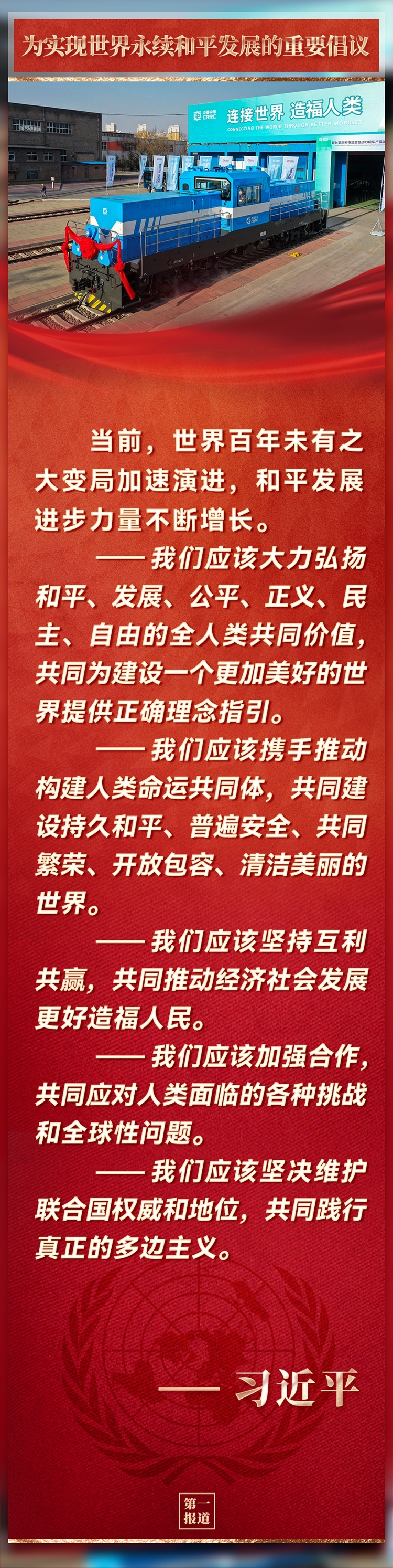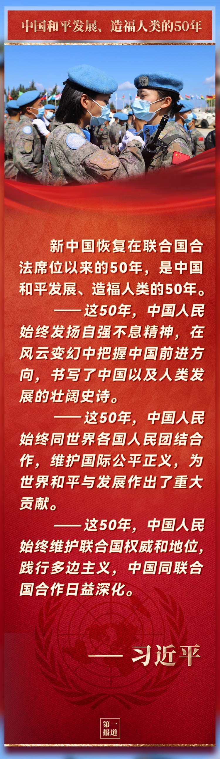 在中华人民共和国恢复联合国合法席位50周年纪念会议上,习近平主席提出重要倡议。国际社会看到,中国智慧和中国方案再次为实现世界永续和平发展注入动力。