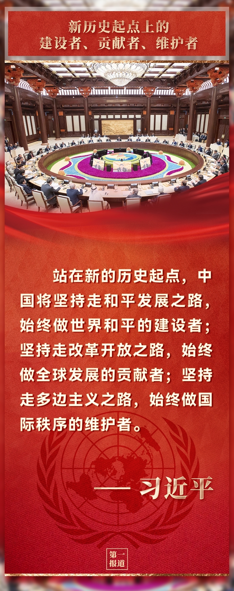 如今,站在新的历史起点上,世界听到中国的坚定声音,看到东方大国作为世界和平的建设者、全球发展的贡献者、国际秩序的维护者,在国际舞台发挥重要作用,为促进人类和平与发展事业作出更大贡献。