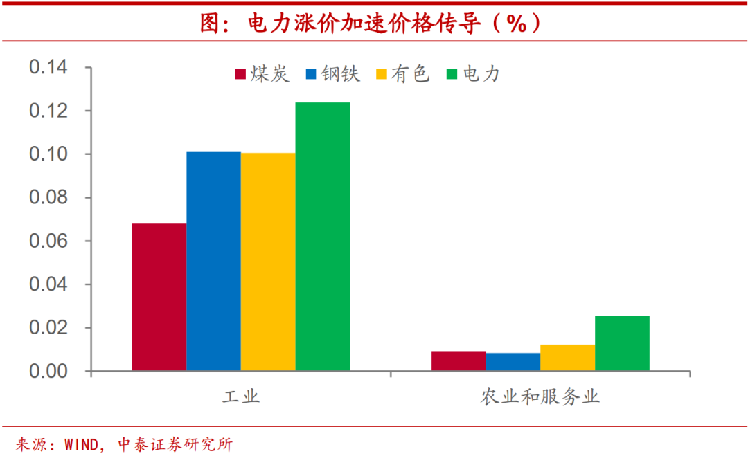 此外,需要注意到的是,在煤炭价格历史高位的情况下,近期电价市场化改革的推进,将使得电力价格也有所上涨。根据投入产出方法所做的测算,同样幅度的价格上涨,电力对于整体物价增速的影响将会明显高于煤炭、钢铁等大宗商品,PPI增速在电力涨价的带动下,自高位下行的速度也或将慢于预期,而电力价格上涨也将加速PPI向CPI增速的传导。
