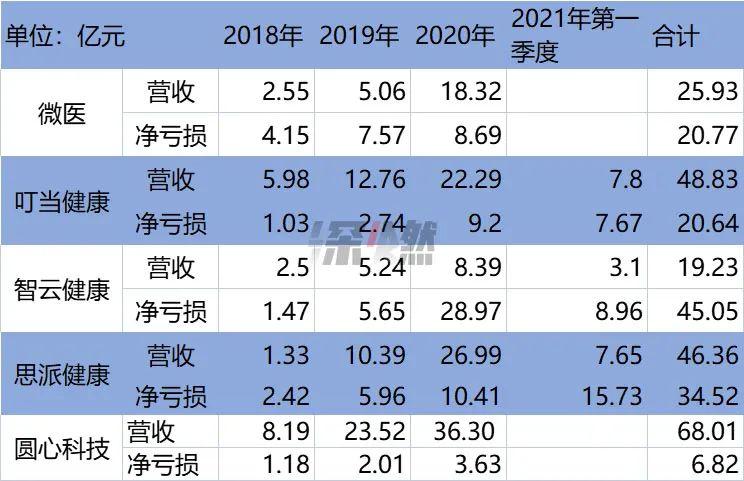 模式类似,这些互联网医疗企业的财务表现也很相似,亏损一个比一个严重。