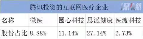 从下图可以看出,腾讯在几家公司的投资所占份额不低,其中,腾讯在思派健康的股权占比已达到27.14%。
