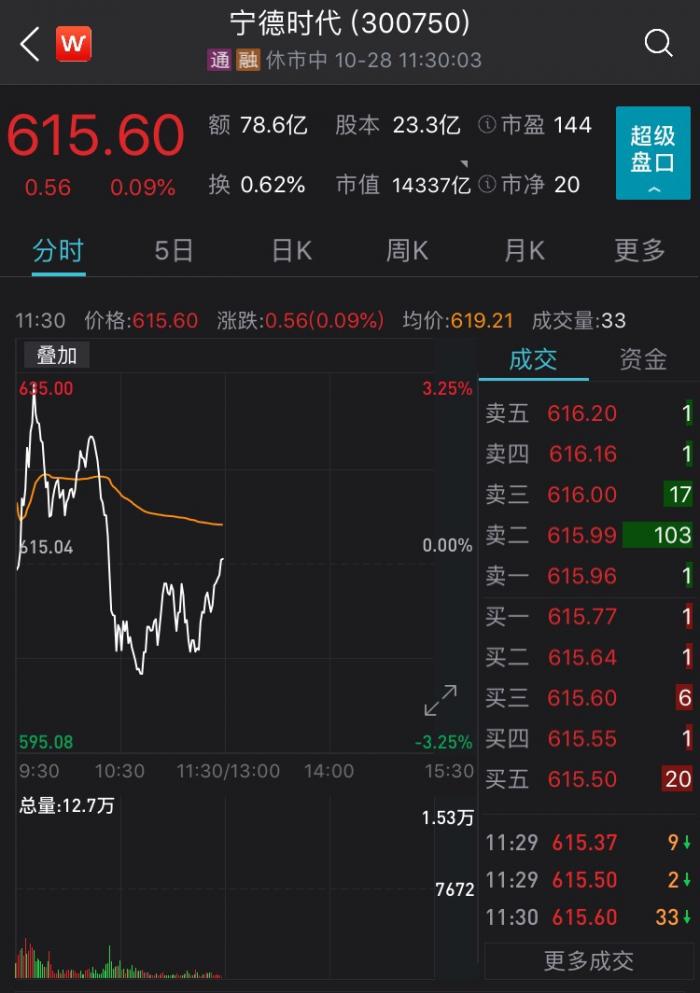 10月28日,宁德时代开盘拉升,随后回落,截至午间收盘,报615.6元/股,涨0.09%。