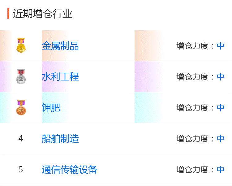 因此,在基金通近期增仓行业数据中可以发现,基金的近期增仓力度不大,均为“中”,更倾向中游金属加工与通信传输设备等领域。