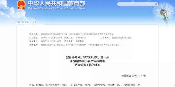 为深入贯彻《中华人民共和国未成年人保护法》等法律法规要求,认真落实中央有关未成年人网络环境治理的决策部署,日前,教育部、中宣部、中央网信办、工信部、公安部、市场监管总局等部门联合印发《关于进一步加强预防中小学生沉迷网络游戏管理工作的通知》(下称《通知》),部署各地做好预防中小学生沉迷网络游戏管理工作。