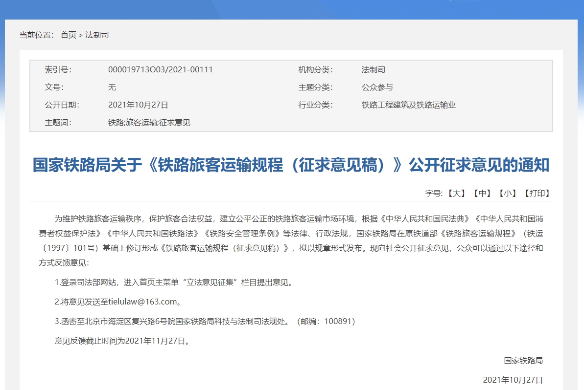征求意见稿表示,为维护铁路旅客运输秩序,保护旅客合法权益,建立公平公正的铁路旅客运输市场环境,根据《中华人民共和国民法典》《中华人民共和国消费者权益保护法》《中华人民共和国铁路法》《铁路安全管理条例》等法律、行政法规,国家铁路局在原铁道部《铁路旅客运输规程》(铁运〔1997〕101号)基础上修订形成《铁路旅客运输规程(征求意见稿)》,拟以规章形式发布。