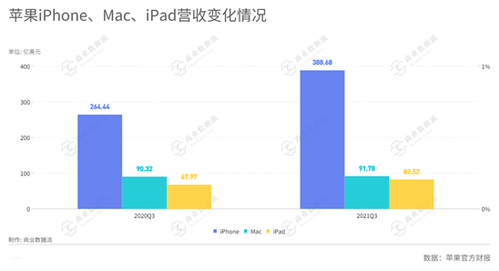 从财报中能够看出,手机业务依旧收入占比最高,收入为388.68亿美元,占总收入的46.62%,不过,相比去年同期手机业务占比的40.87%,苹果在手机部分的收入比重有所提升。