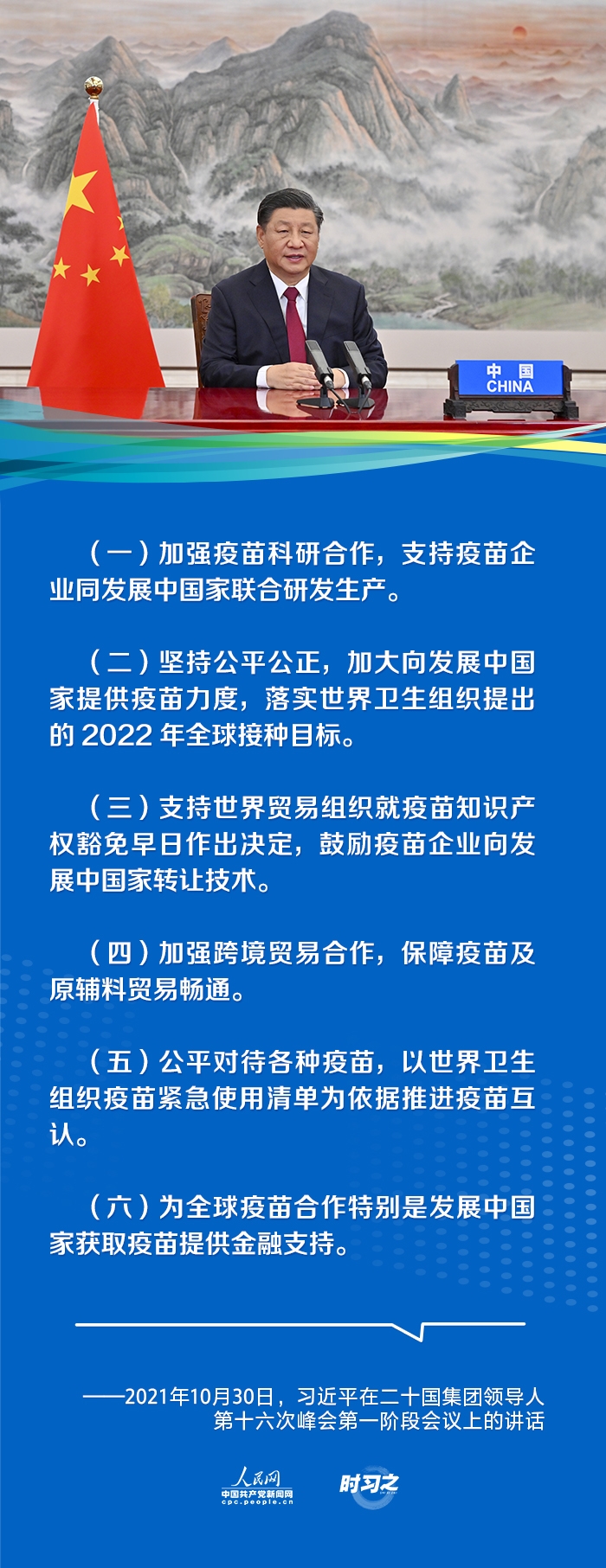 国家主席习近平10月30日在北京以视频方式出席二十国集团领导人第十六次峰会第一阶段会议并发表重要讲话。针对如何团结合作、携手抗疫,习近平提出全球疫苗合作行动倡议。