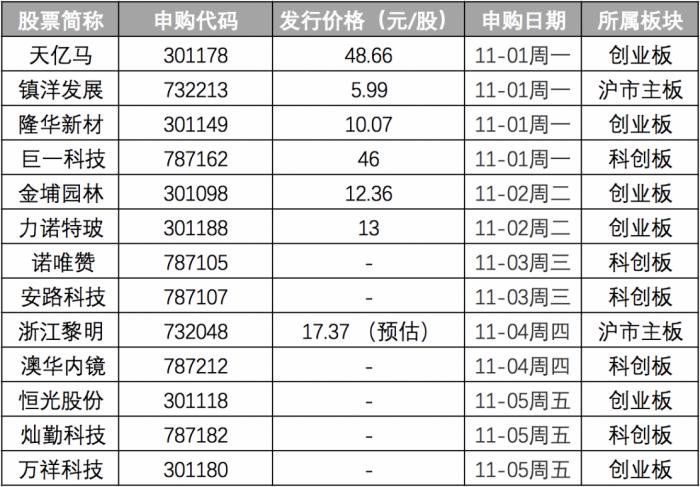 根据新股发行安排,本周(11月1日至11月5日)又有13只新股将开启申购,包括沪市主板2只(浙江黎明、镇洋发展)、科创板5只(巨一科技、诺唯赞、安路科技、澳华内镜、灿勤科技)、创业板6只(天亿马、隆华新材、金埔园林、力诺特玻、恒光股份、万祥科技),累计发行股票数量共约5.93亿股。