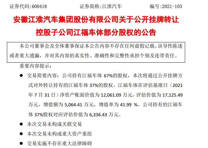 10月29日晚间,江淮汽车(600418.SH)发布公告称,公司拟公开挂牌转让其持有的安徽江淮福臻车体装备有限公司(以下简称江福车体)37%股权,对应评估值为6336.43万元。