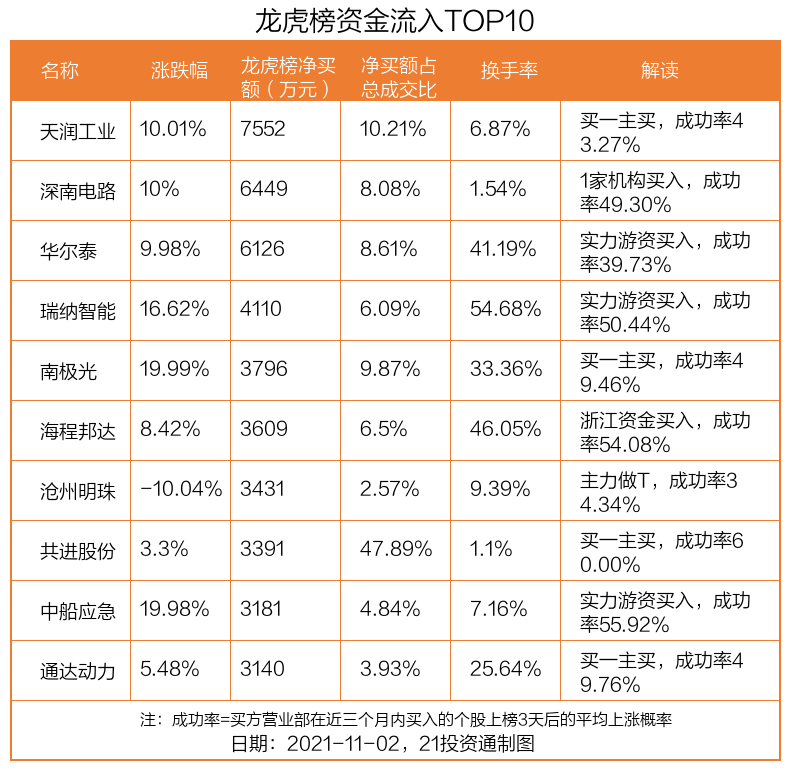11月2日,上证指数下跌1.1%,深证成指下跌0.69%,创业板指上涨0.23%。盘后龙虎榜数据显示,共有43只个股因当日异动登上龙虎榜,资金净流入最多的是天润工业(002283.SZ),达0.76亿元。
