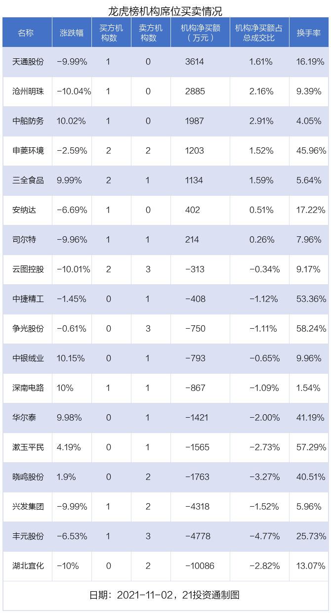 11月2日,18只个股龙虎榜出现了机构的身影,机构合计净卖出1.56亿元。具体来看,机构净买入7股,净卖出11股。