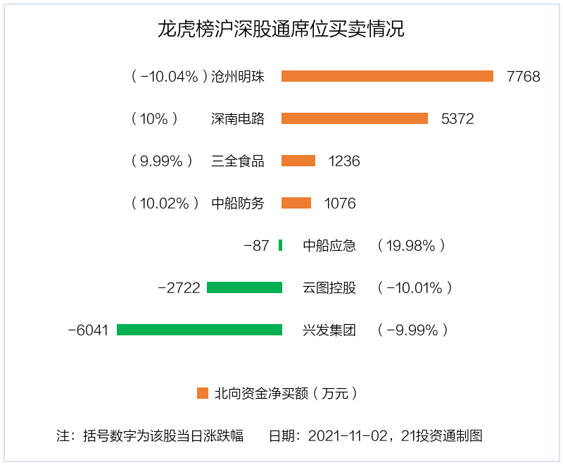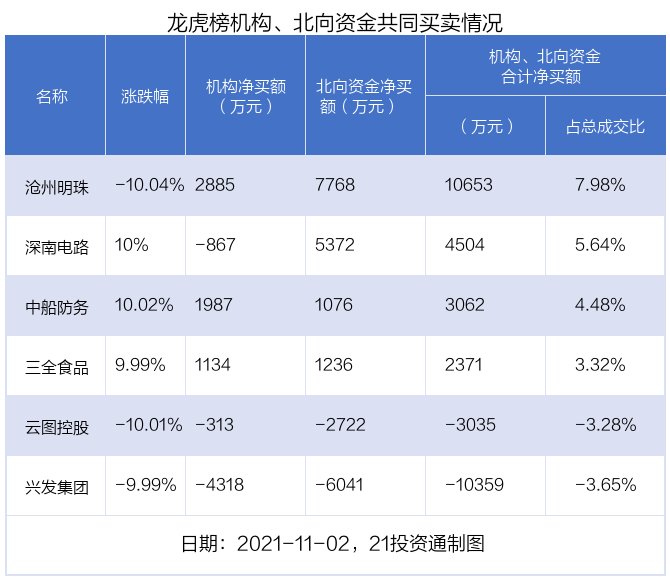值得注意的是,机构和北向资金共同净买入了沧州明珠、三全食品、中船防务;共同净卖出了云图控股、兴发集团;在深南电路上出现分歧,机构净卖出深南电路867.39万元,北向资金净买入5371.66万元。