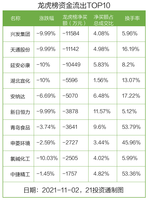 而龙虎榜中资金净流出最多的是兴发集团(600141.SH),被净卖出为1.16亿元,占总成交金额的4.08%。兴发集团收盘下跌9.99%,换手率为5.96%。