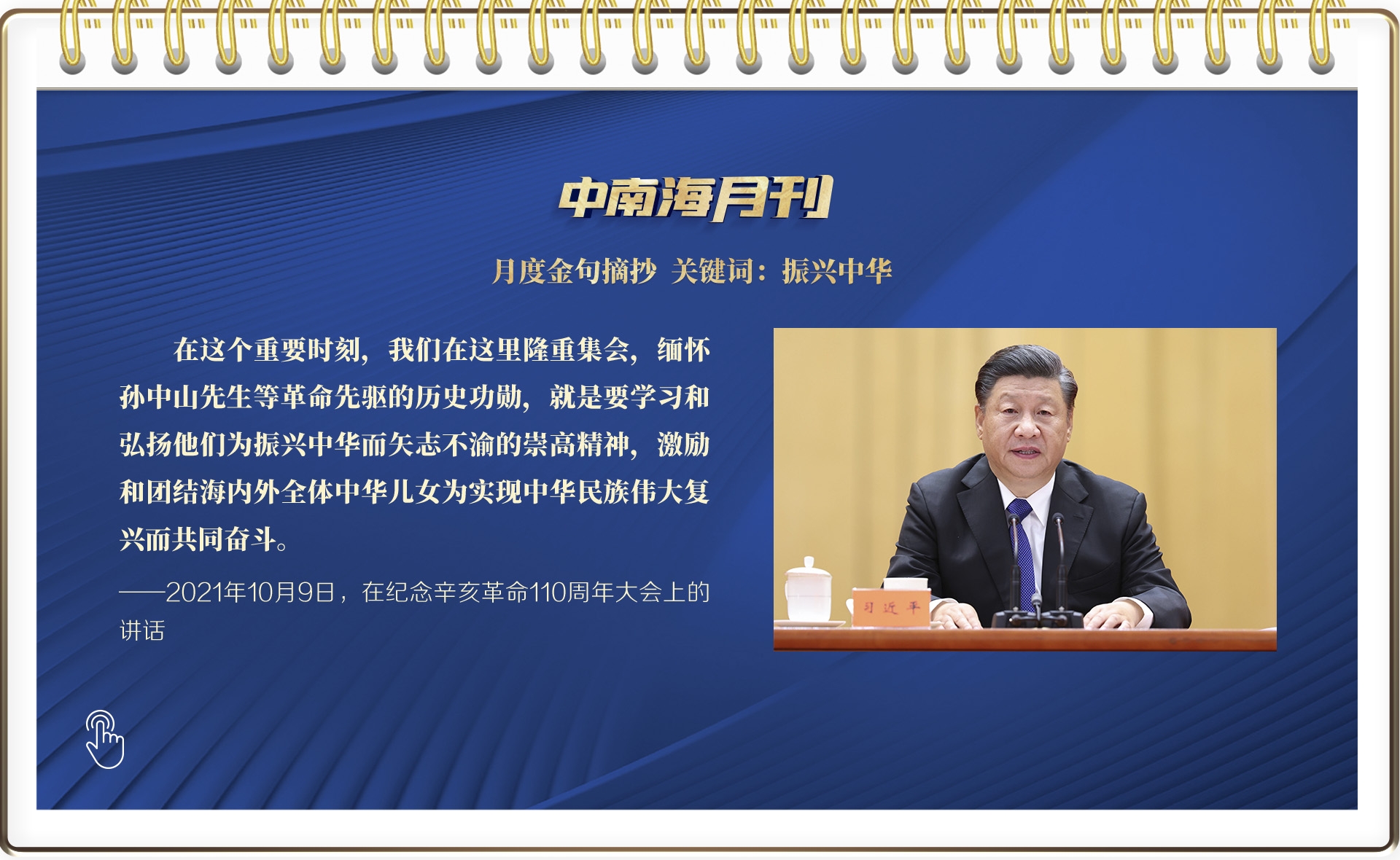出席纪念辛亥革命110周年大会,缅怀孙中山先生等革命先驱的历史功勋;在首次召开的中央人大工作会议上深刻阐释“全过程人民民主”,为新时代加强和改进人大工作指明方向;在中华人民共和国恢复联合国合法席位50周年纪念会议上提出“中国倡议”、宣示“中国立场”;参观国家“十三五”科技创新成就展,要求加快实现高水平科技自立自强;踏访黄河入海口、考察黄河三角洲农高区、登上钻井平台……习近平总书记的10月,一如既往行程满满、步履匆匆。