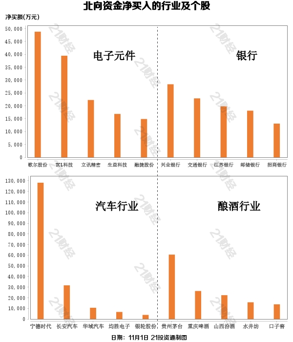 个股方面,北向资金净买入宁德时代(300750.SZ)、贵州茅台(600519.SH)、歌尔股份(002241.SZ)、TCL科技(000100.SZ)、长安汽车(000625.SZ)居前。