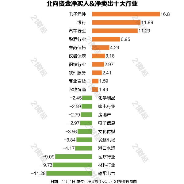 从净买入金额来看,北向资金增持了52个行业,其中电子元件居首,净买入金额达16.80亿元,其次是银行行业,净买入11.99亿元。