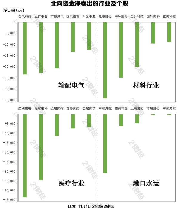 北向资金减持了48个行业,其中输配电气最多,净卖出金额达11.28亿元,其次是材料行业,净卖出9.73亿元。