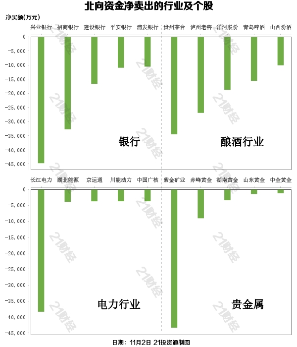 其中,兴业银行被净卖出4.47亿元,紫金矿业被净卖出4.34亿元,长江电力被净卖出3.84亿元,贵州茅台被净卖出3.45亿元,三一重工被净卖出3.39亿元。