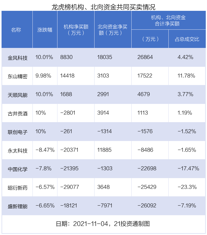 值得注意的是,机构和北向资金共同净买入了金风科技、东山精密等3股;共同净卖出了中国化学、联创电子等3股;在永太科技、古井贡酒、昭衍新药上出现分歧,机构净卖出永太科技2.04亿元,北向资金净买入1.19亿元;机构净卖出古井贡酒2801.15万元,北向资金净买入3913.68万元;机构净卖出昭衍新药2.91亿元,北向资金净买入3647.91万元。