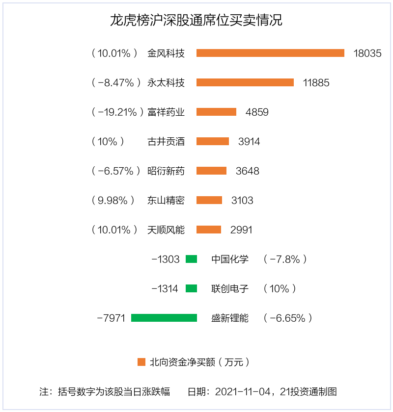 11月4日,北向资金参与龙虎榜中的个股共有10只,合计净买入3.78亿元。其中沪股通净买入1 股,净卖出1 股,合计净买入2345.01万元;深股通净买入6 股,净卖出2 股,合计净买入3.55亿元。