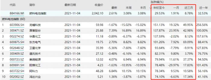 燃料电池板块个股看,龙蟠科技、厚普股份、华昌化工、东方电气年初至今股价已翻倍,分别大涨151.13%、137.87%、137.59%、101.26%。