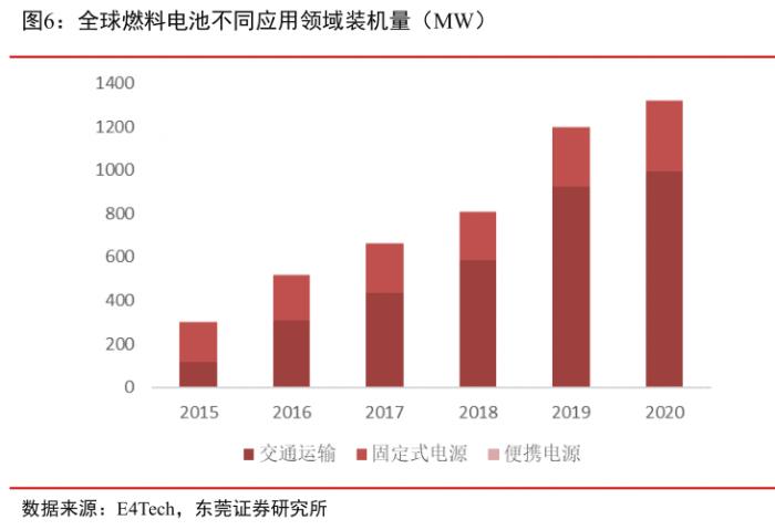 近年来燃料电池在交通运输领域需求量呈现爆发式增长。2020年全球燃料电池装机量达1319.4MW,2015-2020年复合增长率达35%;其中交通运输领域的需求上升尤为显著,年复合增长率达54%,2020年装机量994MW,占总装机量的75%。