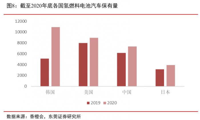 发展氢能已成为全球主要国家的共识。氢能作为重要的清洁能源,是能源技术革命的重要方向。作为能源技术革命的重要方向和未来能源战略的重要组成部分,氢燃料电池汽车也得到了各国高度重视。截至2020年底,全球氢燃料电池汽车保有量为32535辆,同比增长38%。其中,韩国成为首个氢车保有量达到万辆级别的国家,占全球保有量的34%,位居全球第一。美国、中国、日本位列二、三、四位。